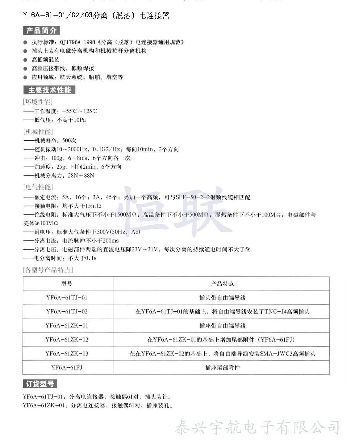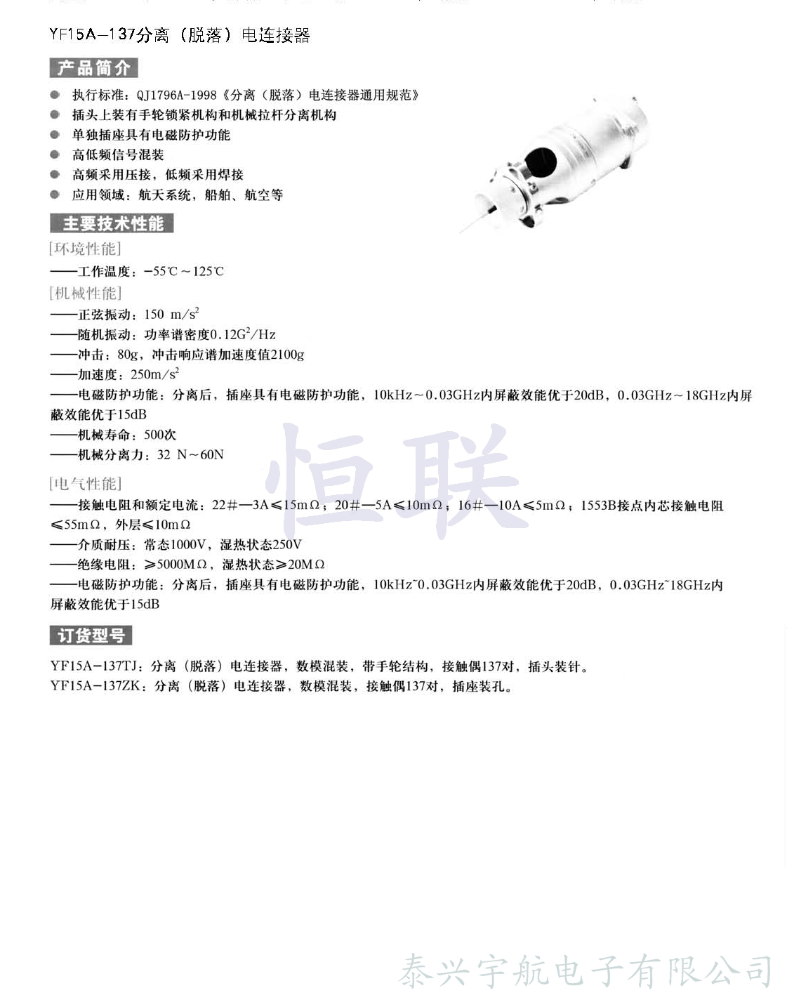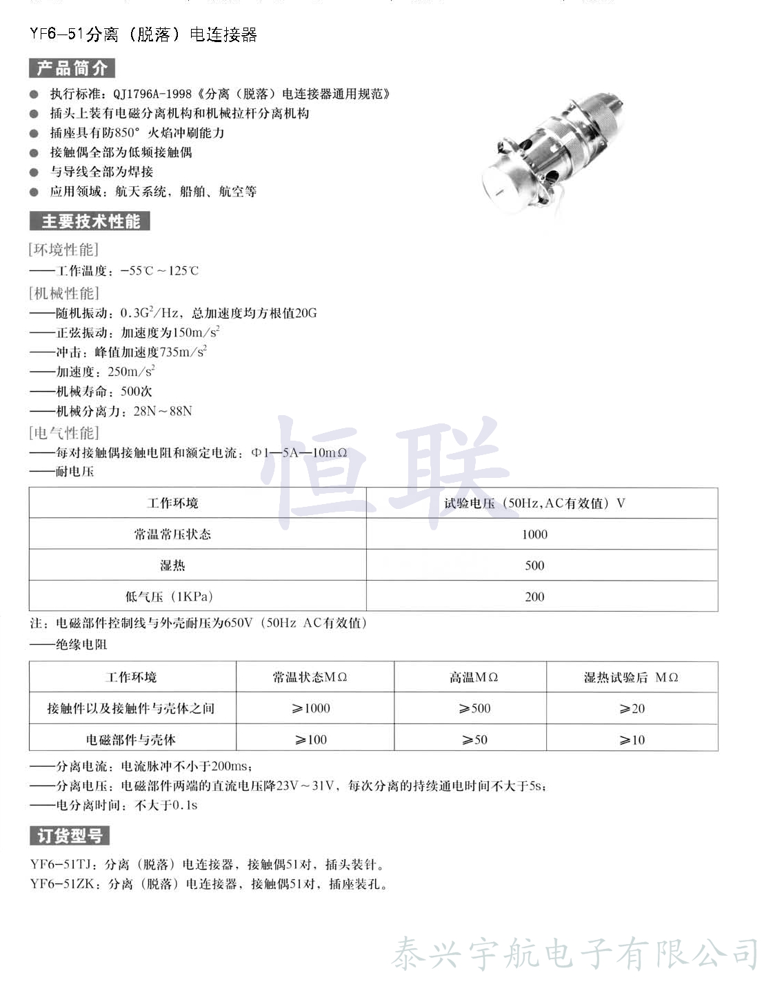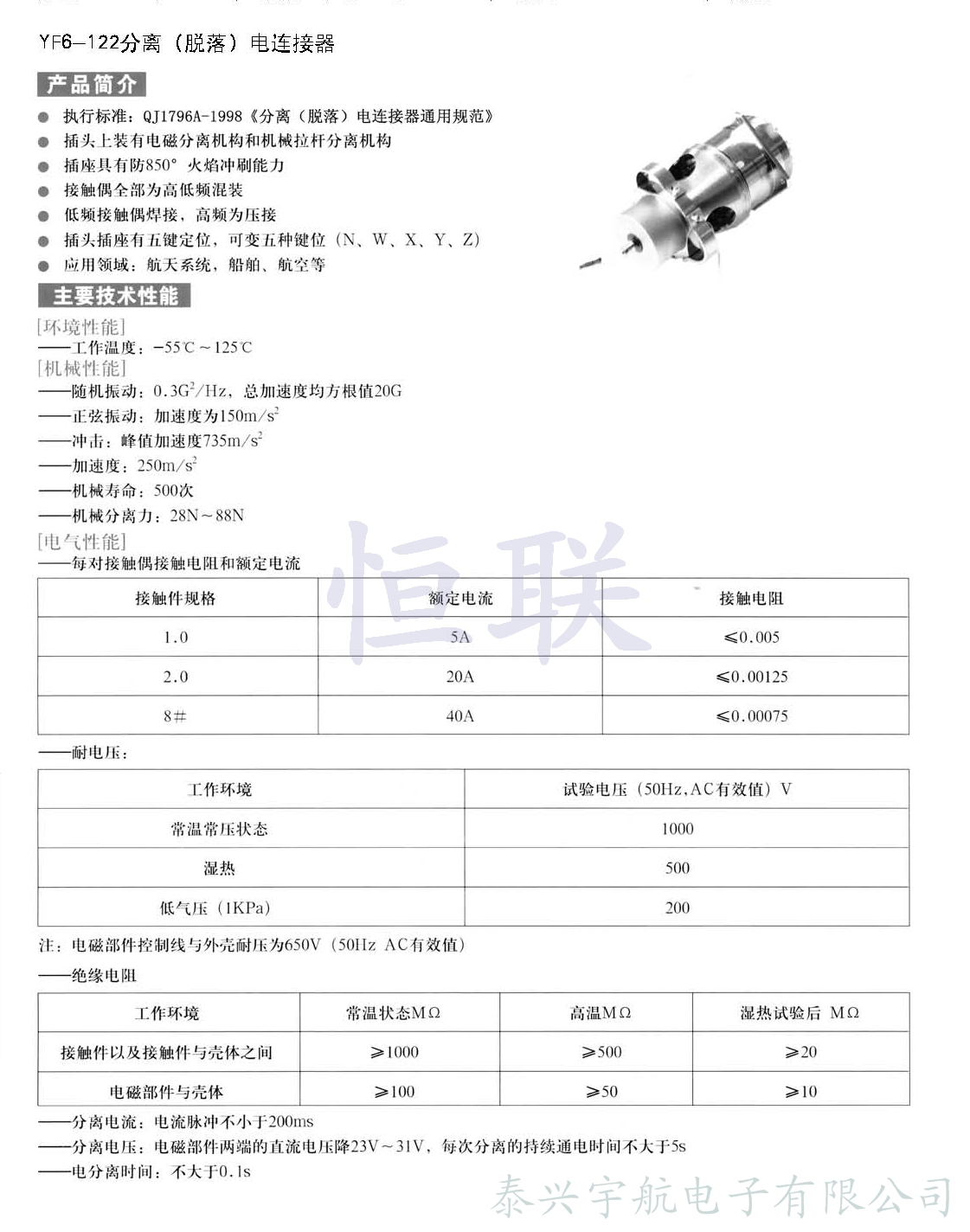 YF型圓形分離電連接器適用于具有小型化要求的戰(zhàn)略戰(zhàn)術(shù)武器系統(tǒng)、航天運載系統(tǒng)的級間電氣線路連接和系統(tǒng)與地面設(shè)備的電路連接,以及其他工業(yè)設(shè)備的電氣連接,并可做瞬間電磁分離和機械分離。
