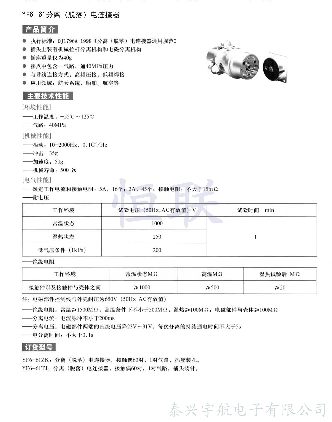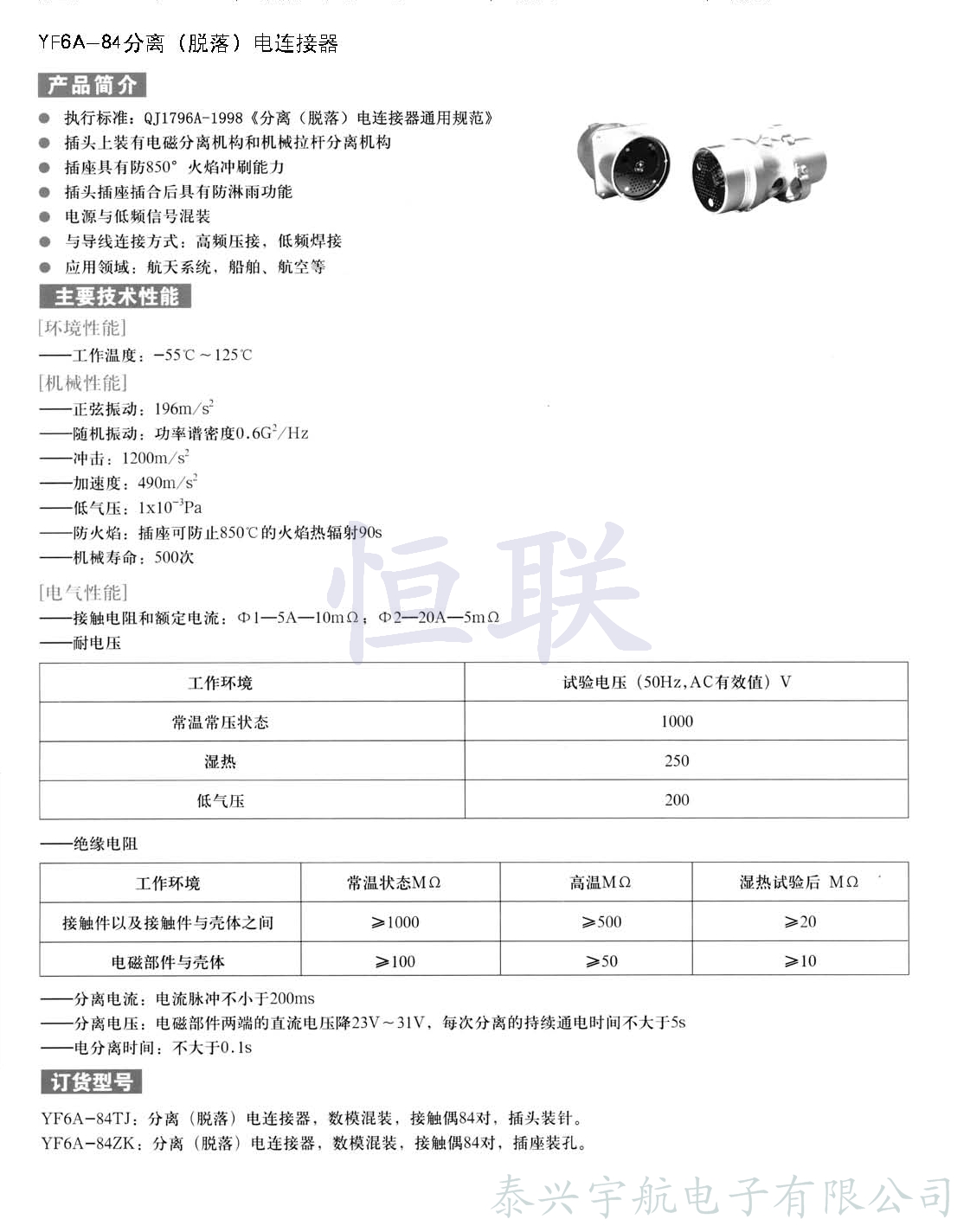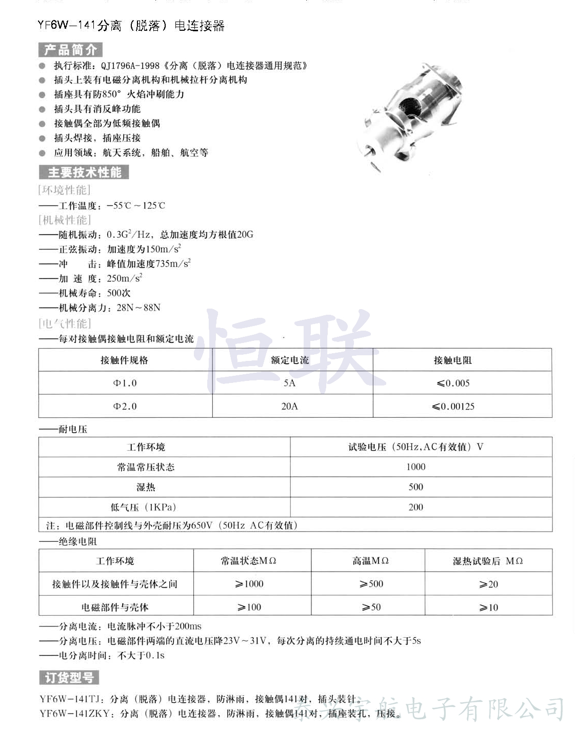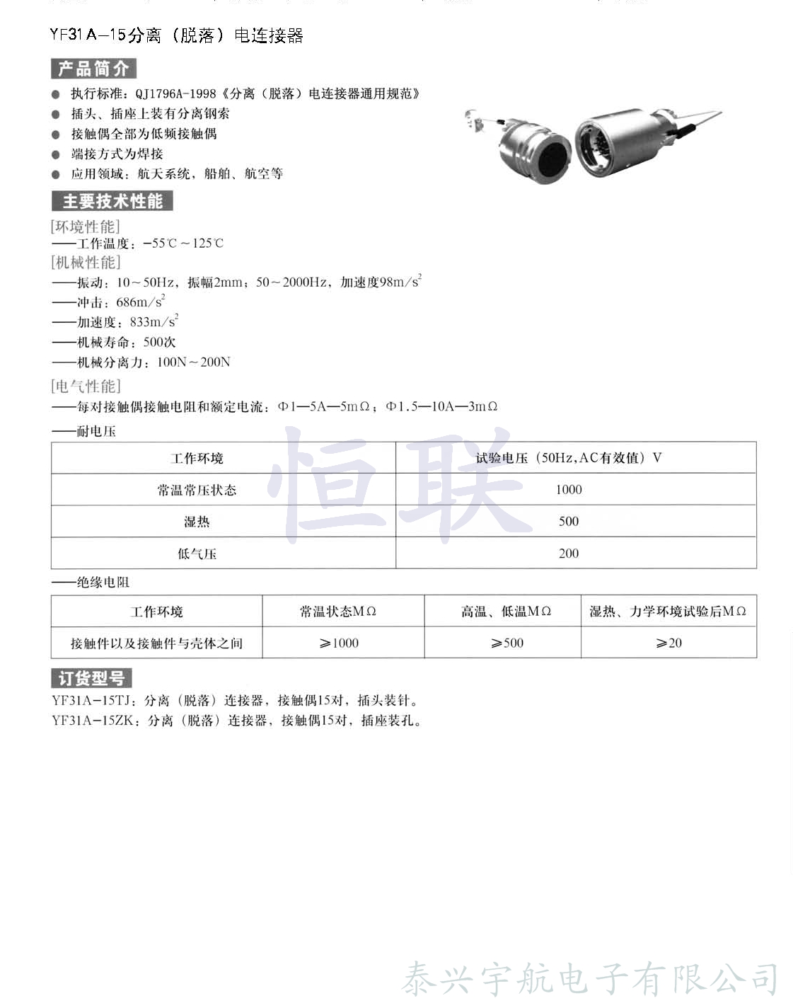 YF型圓形分離電連接器適用于具有小型化要求的戰(zhàn)略戰(zhàn)術(shù)武器系統(tǒng)、航天運載系統(tǒng)的級間電氣線路連接和系統(tǒng)與地面設(shè)備的電路連接,以及其他工業(yè)設(shè)備的電氣連接,并可做瞬間電磁分離和機械分離。