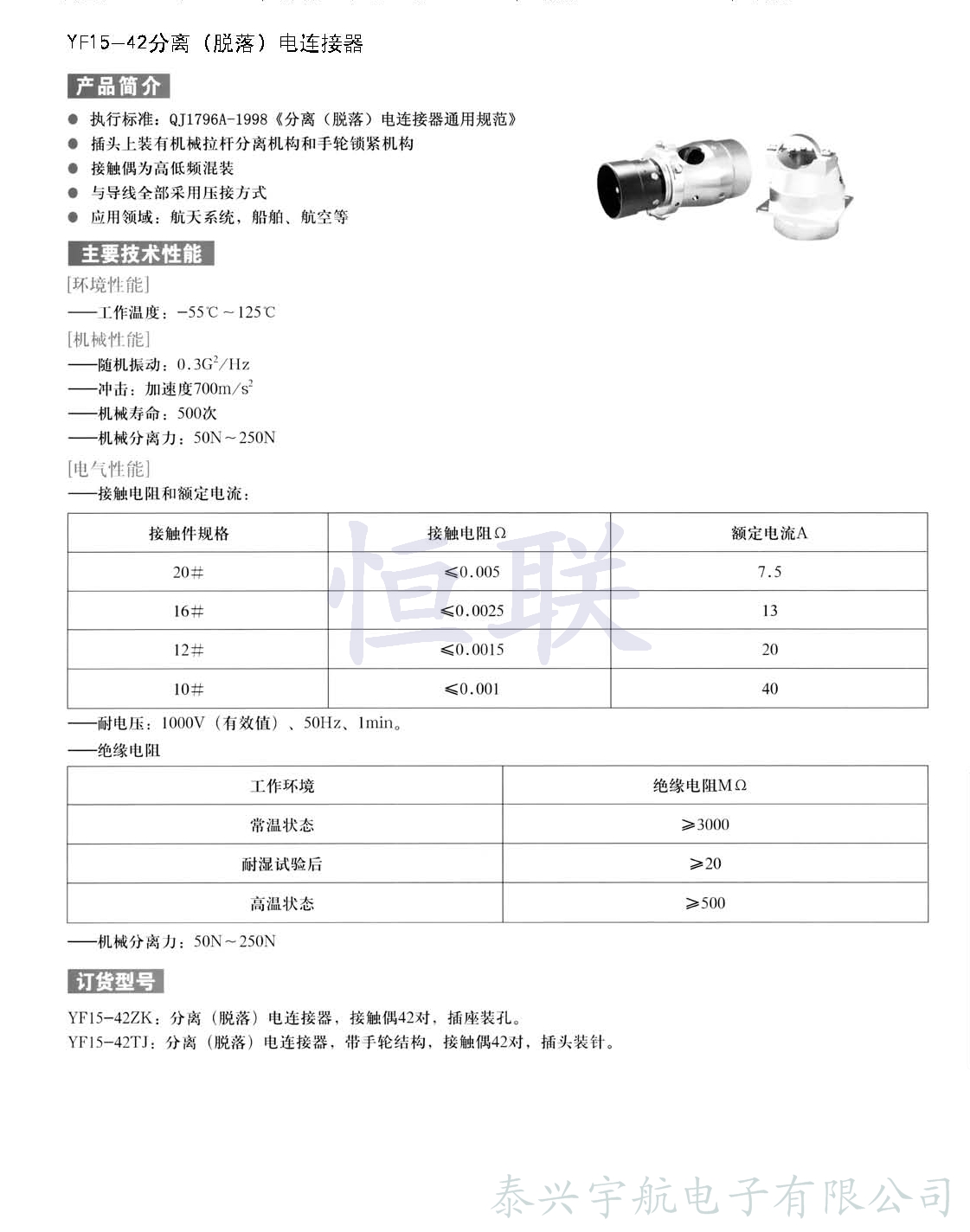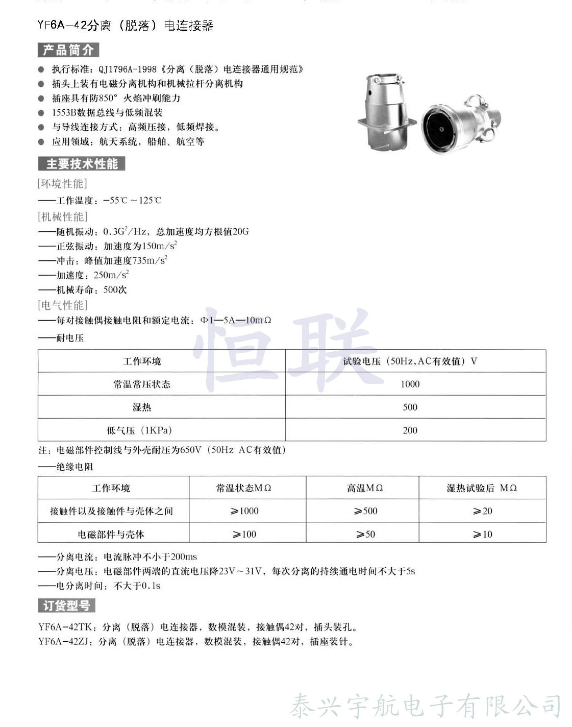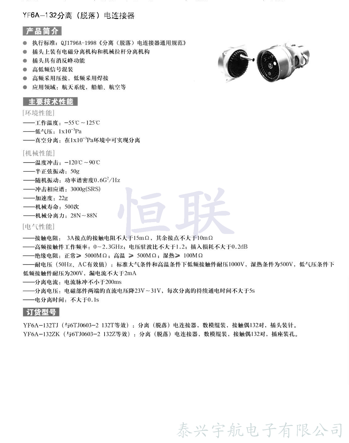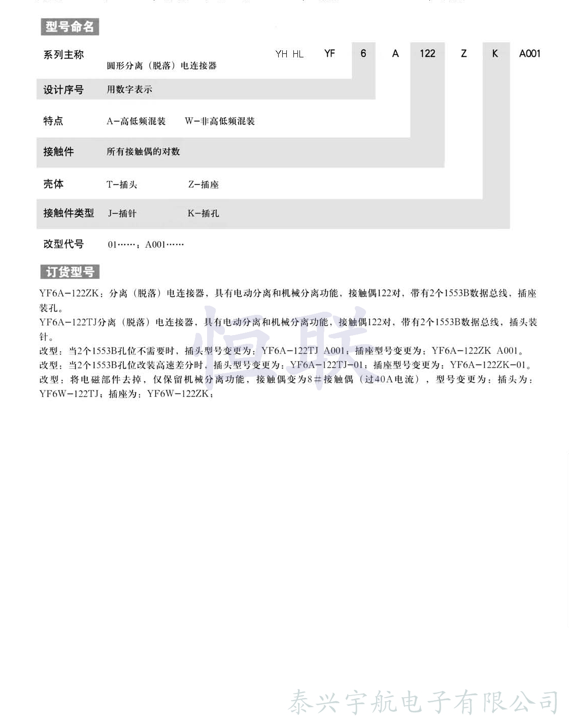 YF型圓形分離電連接器適用于具有小型化要求的戰(zhàn)略戰(zhàn)術(shù)武器系統(tǒng)、航天運載系統(tǒng)的級間電氣線路連接和系統(tǒng)與地面設(shè)備的電路連接,以及其他工業(yè)設(shè)備的電氣連接,并可做瞬間電磁分離和機械分離。