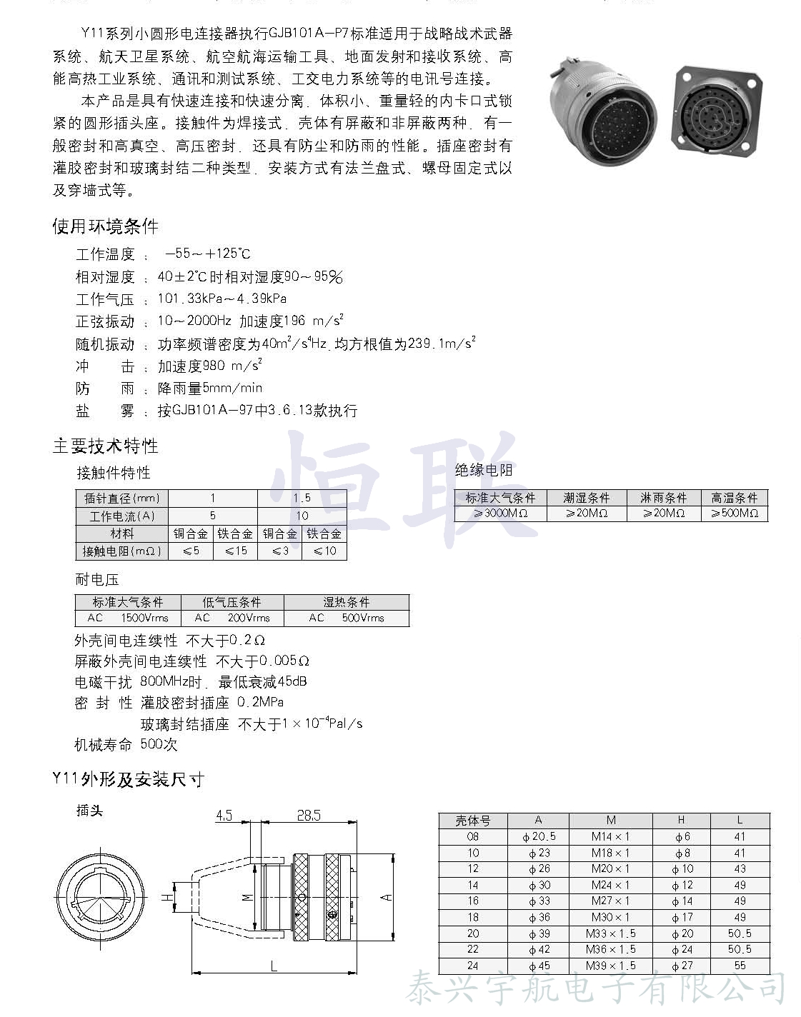 Y11系列圓形密封電連接器(航空插頭)具有快速連接,快速分離,體積小,重量輕之特點(diǎn),采用內(nèi)卡口式鎖緊方式,接觸件端接為焊接式,殼體有屏蔽式和非屏蔽式,使用便捷,通用性好,功能多樣,規(guī)格齊全,符合GJB101A—97要求。