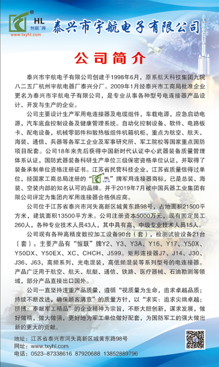 公司位于江蘇省泰興市河失高新區(qū)城黃東路98號,占地面積21500平方米,建筑面積13500平方米。公司注冊資本5000萬元,現(xiàn)有固定員工260人,各種專業(yè)技術人員43人,其中具有高、中級專業(yè)技術人員15人。公司現(xiàn)有各種高精度數(shù)控加工設備90臺(套),檢測試驗設備21臺(套)。主要產(chǎn)品有【恒聯(lián)牌】Y2、Y3、Y3A、Y16、 Y17、Y50X、Y50DX、Y50EX、 XC、CHCH、J599。 矩形連接器J7、J14、J30、J36、J63,高頻系列,光電混裝,高低頻混裝等系列型號的電連接器。產(chǎn)品廣泛用于航空、航天、航艇、通信、鐵路、醫(yī)療器械、石油勘測等領域,部分產(chǎn)品直接出口國外。